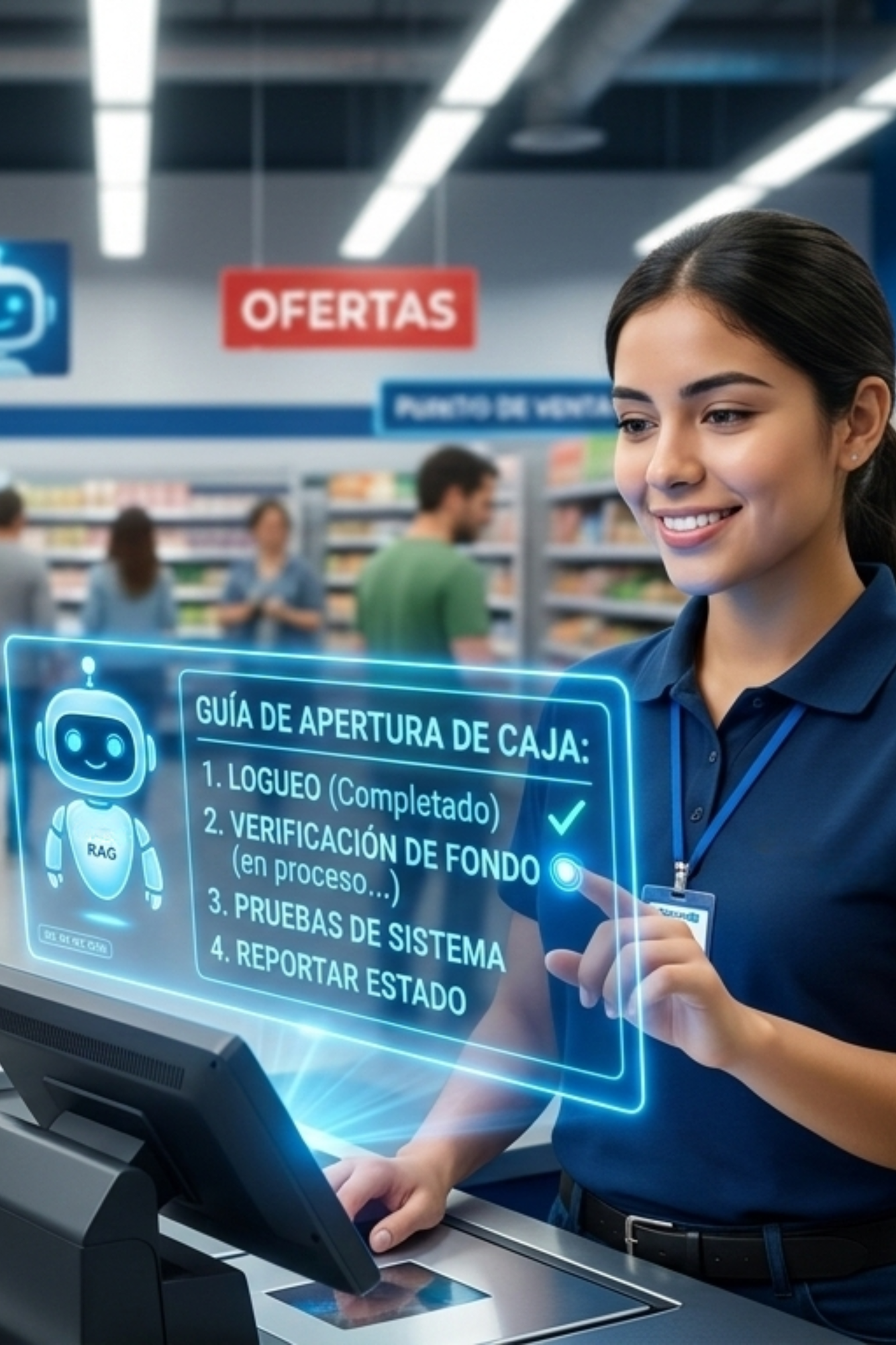 Una importante cadena de supermercados en México, enfrentaba constantes interrupciones en tienda debido a dudas operativas del personal. Necesitaban implementar un sistema de consulta operativa basado en conocimiento interno.